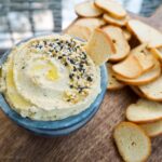 Then spoon the hummus into a bowl and top with a drizzle of oil oil and a sprinkling with Everything Bagel seasoning. Dig in with bagel chips (duh!) or veggies, pretzels or pita.