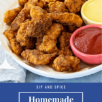 We make these Homemade Hot Chicken Nuggets with a simple three-part dredge of flour, egg and flour and then shallow-pan fry them until crispy. Keep them warm on a rack in the oven while finishing the cooking and serve with dipping sauces or let them cool all the way and freeze them for homemade frozen chicken nuggets. Even better than the stuff from the store on a late night when nothing else will do!