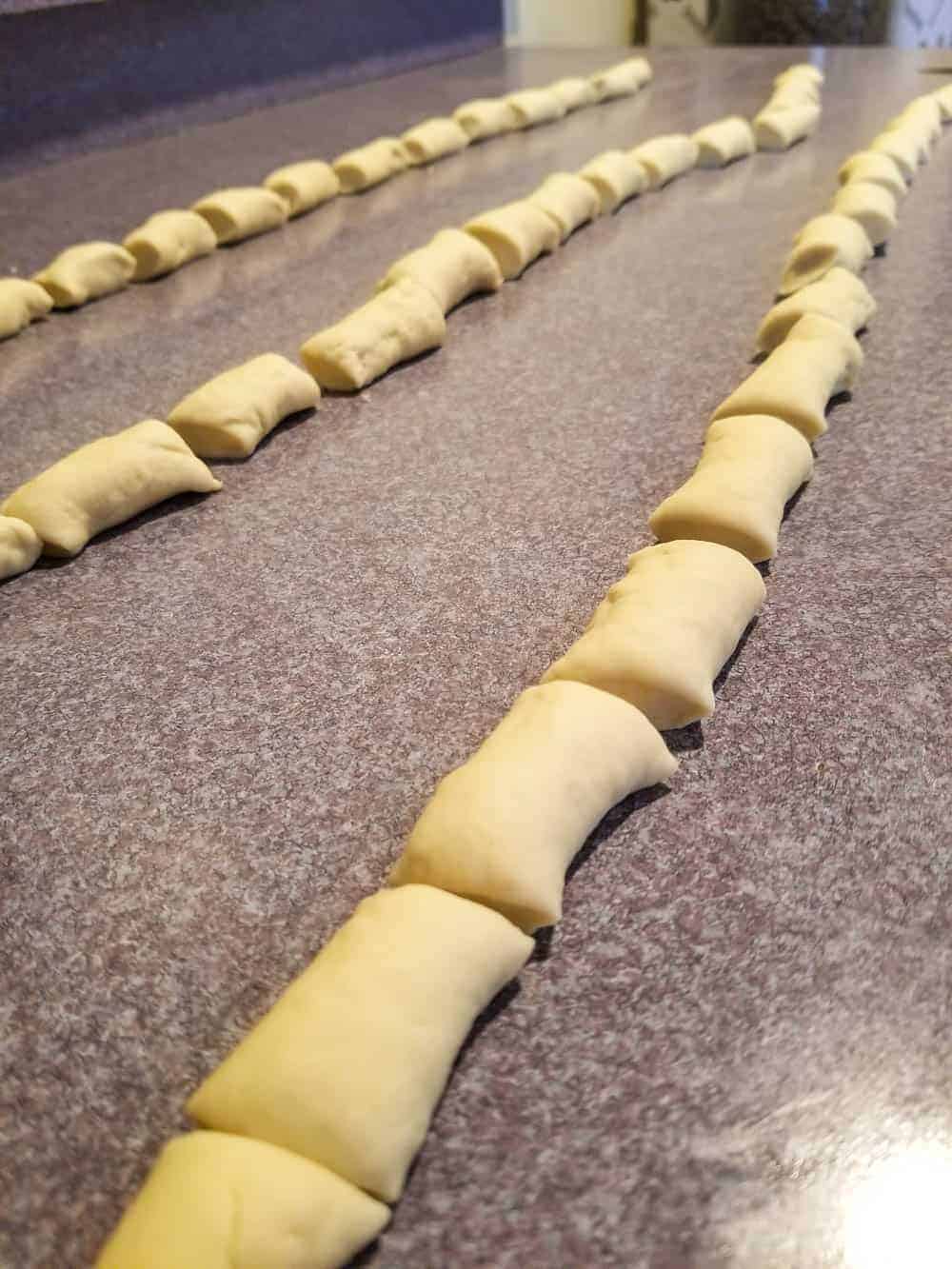 - Meanwhile, turn the dough out onto a lightly oiled work surface and divide into 8 equal pieces. Roll out each piece of dough into a rope about 1-inch thick. Cut into 1 1/2 inch pieces (they'll shrink up a bit as cut, no worries!)